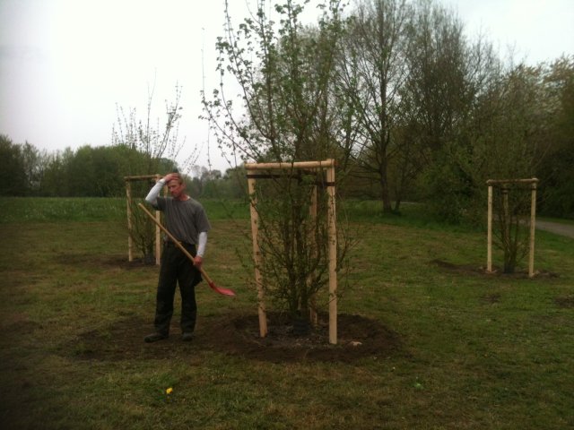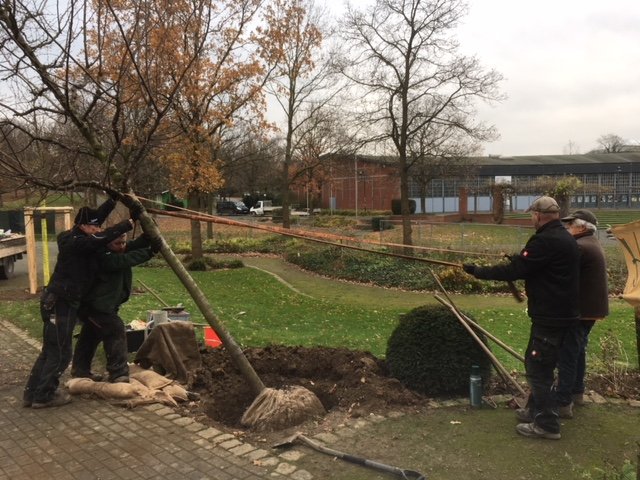 Deutschlands größter Optiker Fielmann stiftet der Stadt Mülheim an der Ruhr zehn Vogelkirschen. Am Freitag, 18. Dezember 2015, setzen die Leiterin des städtischen Grünflächenmanagements, Sylvia Waage und die beiden Leiter der örtlichen Fielmann-Niederlassungen, Monika Finickel und Carsten Spiegel, zum gemeinsamen Spatenstich an.